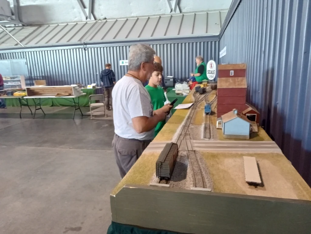 Set up at International Rail Fair in Sacramento. We added a new extension on this end to eliminate some 0-5-0 switching. Here Dave is instructing a new operator. We have two goals for showing the layout: to show S Scale in action and to get people to experience the fun of operating a layout with some sense of purpose.